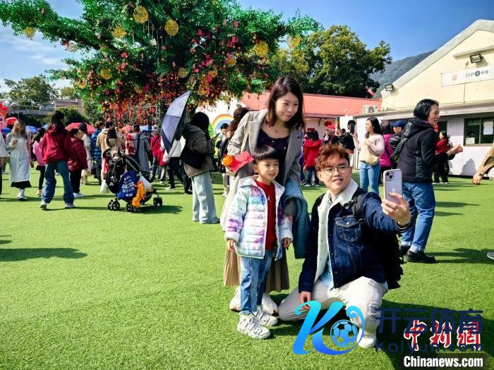 1月29日,“香港许诺节2025”在香港大埔区林村许诺广场举行。往广场中央的许诺树上抛“宝牒”是许诺节重心行为,诱骗大竣工球前来。图为香港市民在许诺树前合影。 中新社记者 刘大炜 摄