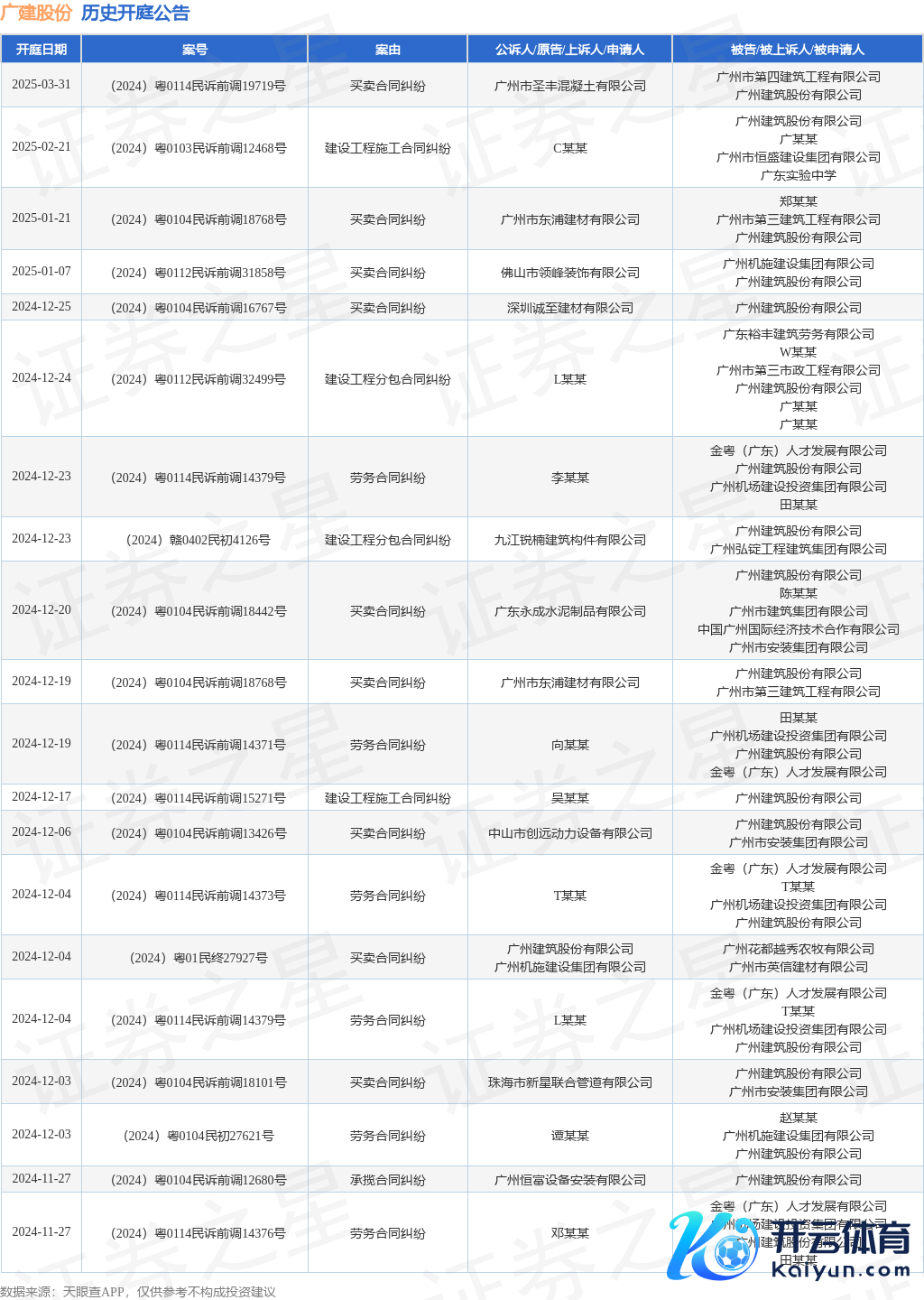 案号:(2024)粤0112民初21043号审理法院:广州市黄埔区东说念主民法院案由:商业条约纠纷当事东说念主信息: 原告/上诉东说念主:广州承隆建材有限公司 被告/被上诉东说念主:广州机施开拓集团有限公司、广州建筑股份有限公司开庭日历:2024年11月26日左证统计,近一年内以广州建筑股份有限公司为当事东说念主的历史开庭公告有400则,其中案由为“劳动争议”的公告以100则居首,其次为“商业条约纠纷”有96则,“开拓工程施工条约纠纷”有46则。历史开庭公告(前20条)如下: