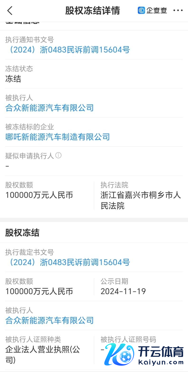 同期,哪吒的母公司-合众新动力汽车股份有限公司增多了一条股权冻结的音尘。金额高达10亿元,将于2024年11月19日起冻结至2027年11月19日。