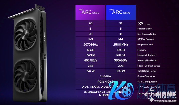 具体规格方面,锐炫B580领有20个Xe中枢、5个渲染切片、20个光追单位、160个XMX AI引擎,频率2670MHz,配备192bit 12GB显存,显存带宽456GB/s,算力可达233TOPs,功耗190W。锐炫B570则领有18个Xe中枢、5个渲染切片、18个光追单位、144个XMX AI引擎,频率2500MHz,配备160bit 10GB显存,显存带宽380GB/s,算力可达203TOPs,功耗更低为150W。