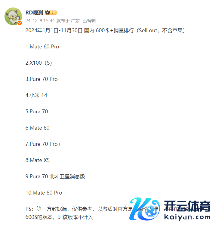 12月8日行业东说念主士“RD不雅测”给出了一组数据,这组数据展示的是2024年1-11月国内售价600好意思元以上单品销量Top10,留意这个数据是不包含的,仅仅安卓阵营的排行。数据显露: