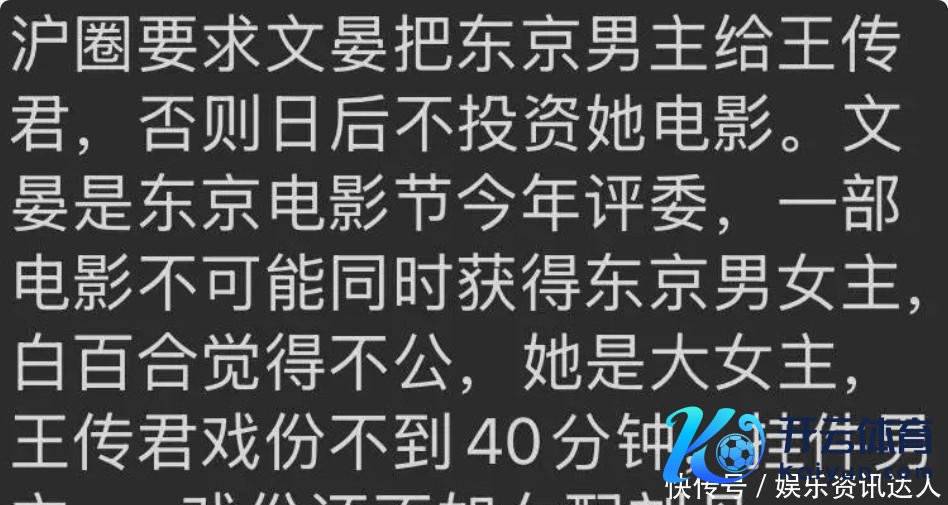紧接着,有音书传出,“沪圈老本”在幕后操控,威逼评委文晏必须把影帝奖给王传君,不然就会罢手投资。