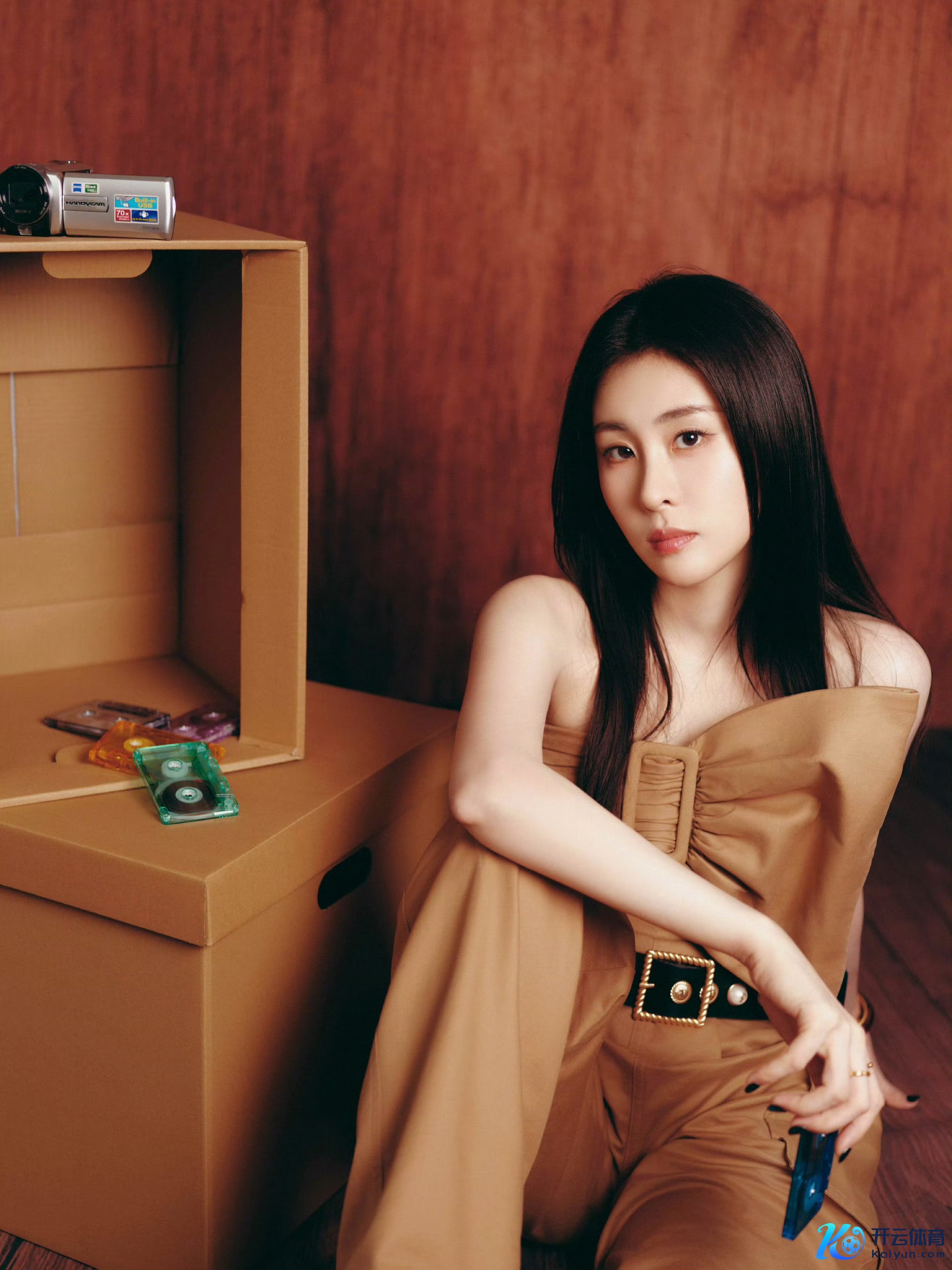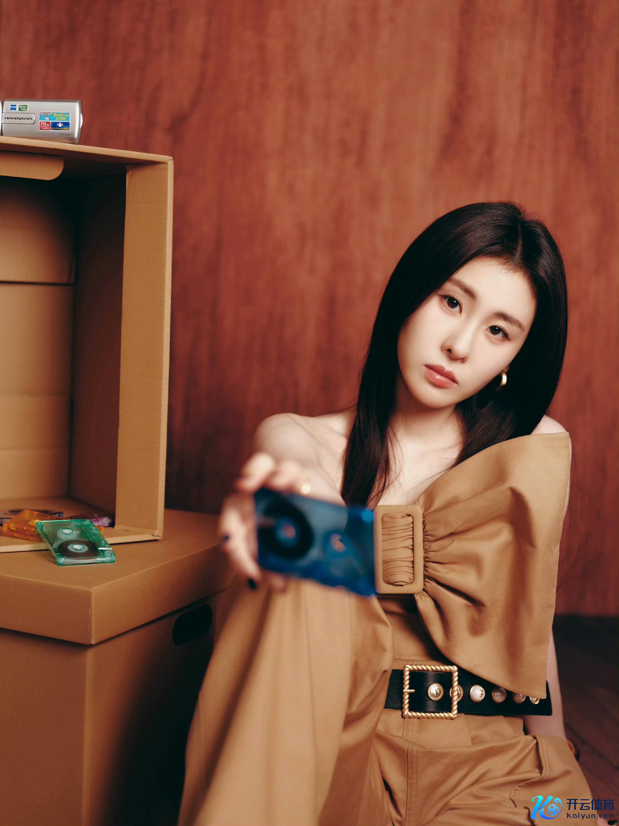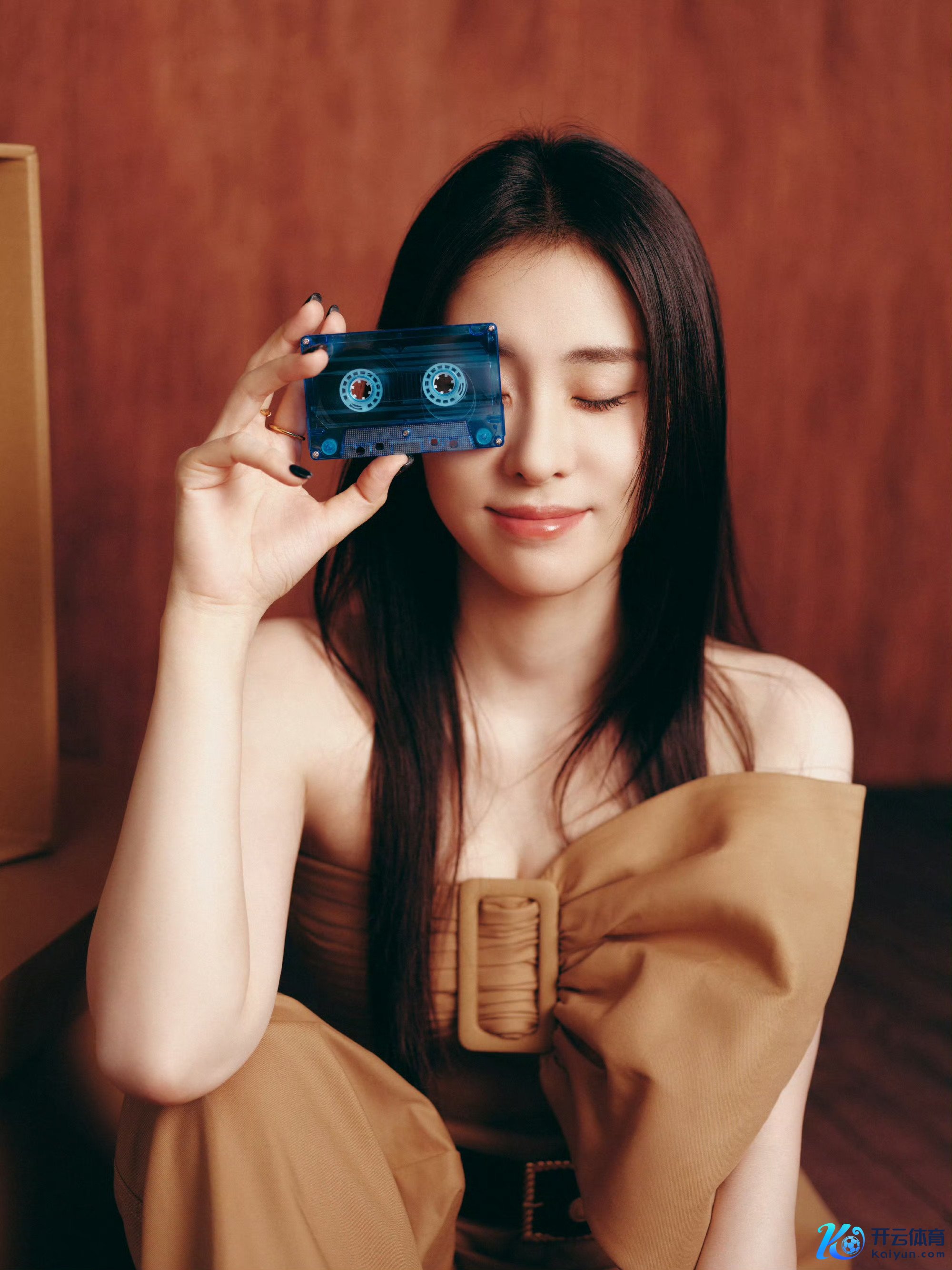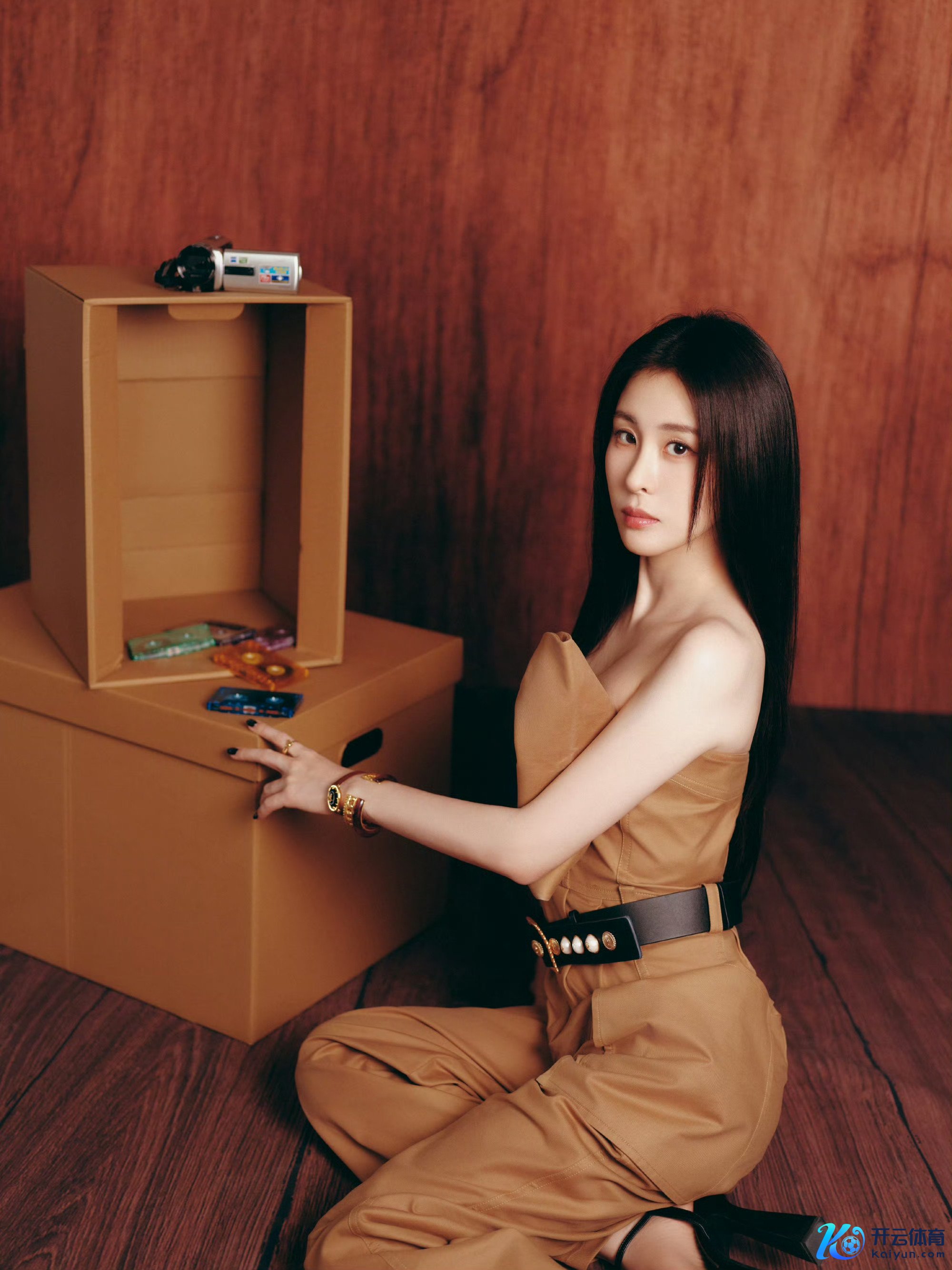 镜头里的她,一袭无袖卡其连体裤衬得肩颈线条利落又舒展,腰间玄色皮带缀着珍珠与金属扣,像是把守旧唱片的纵情缝进了工装的飒爽里。她或把透明磁带轻抵额头,或指尖勾着磁带向镜头轻晃,棕木配景的暖调裹着旧物的和煦,让「Ost女王」的气场里多了几分意马心猿的慵懒——这正是她如今的情状:在音乐里千里淀,在作风里自洽。