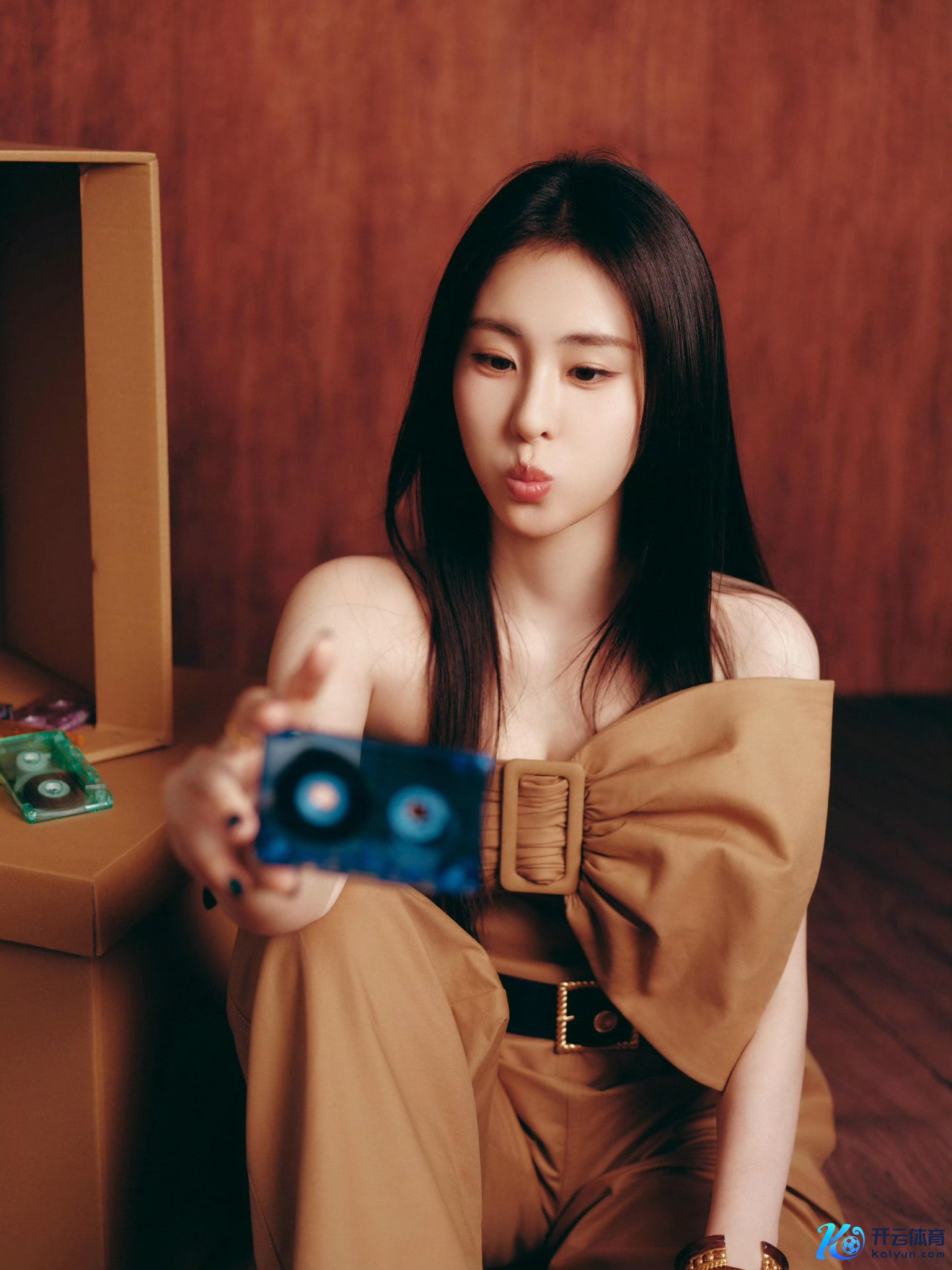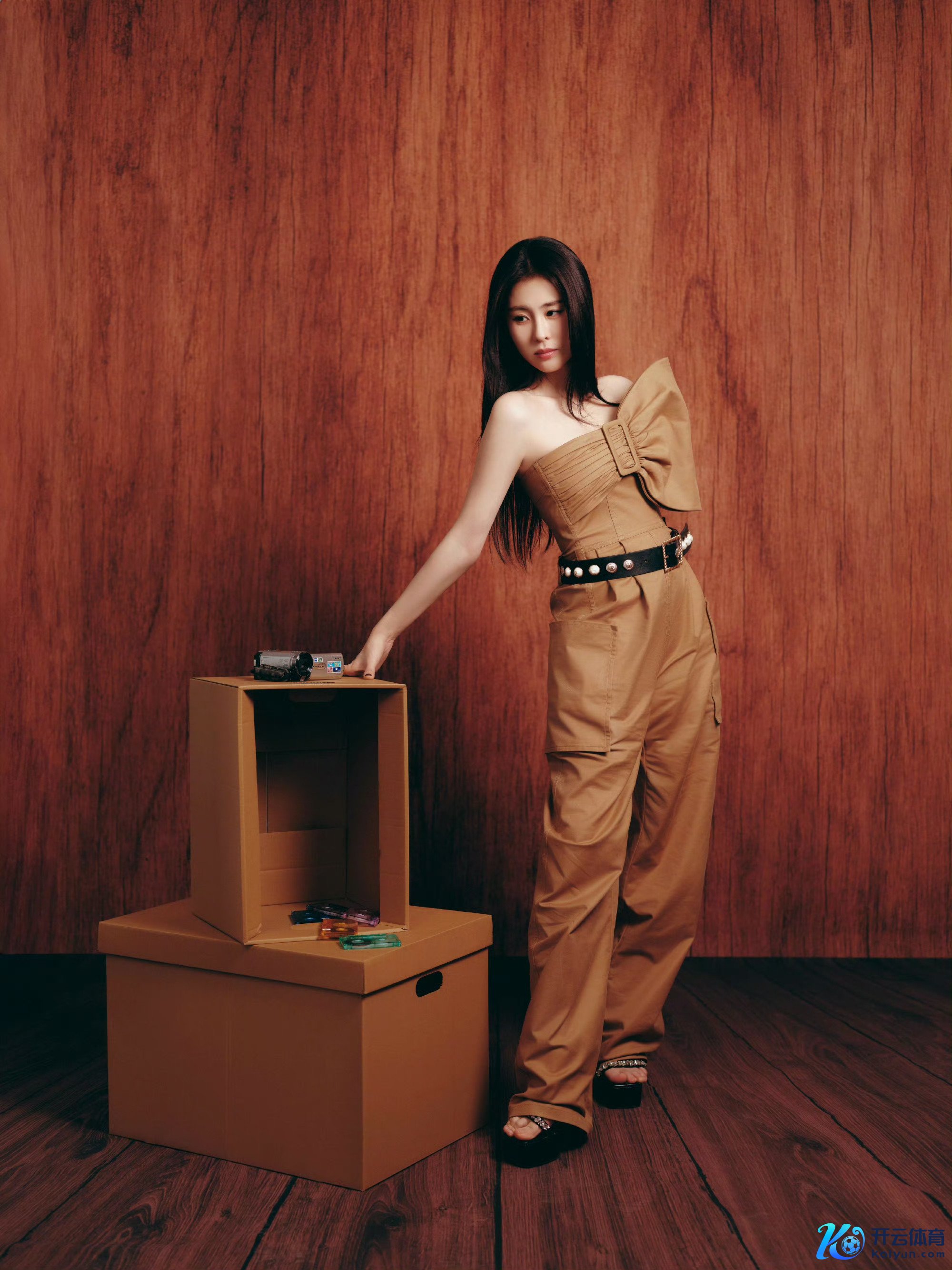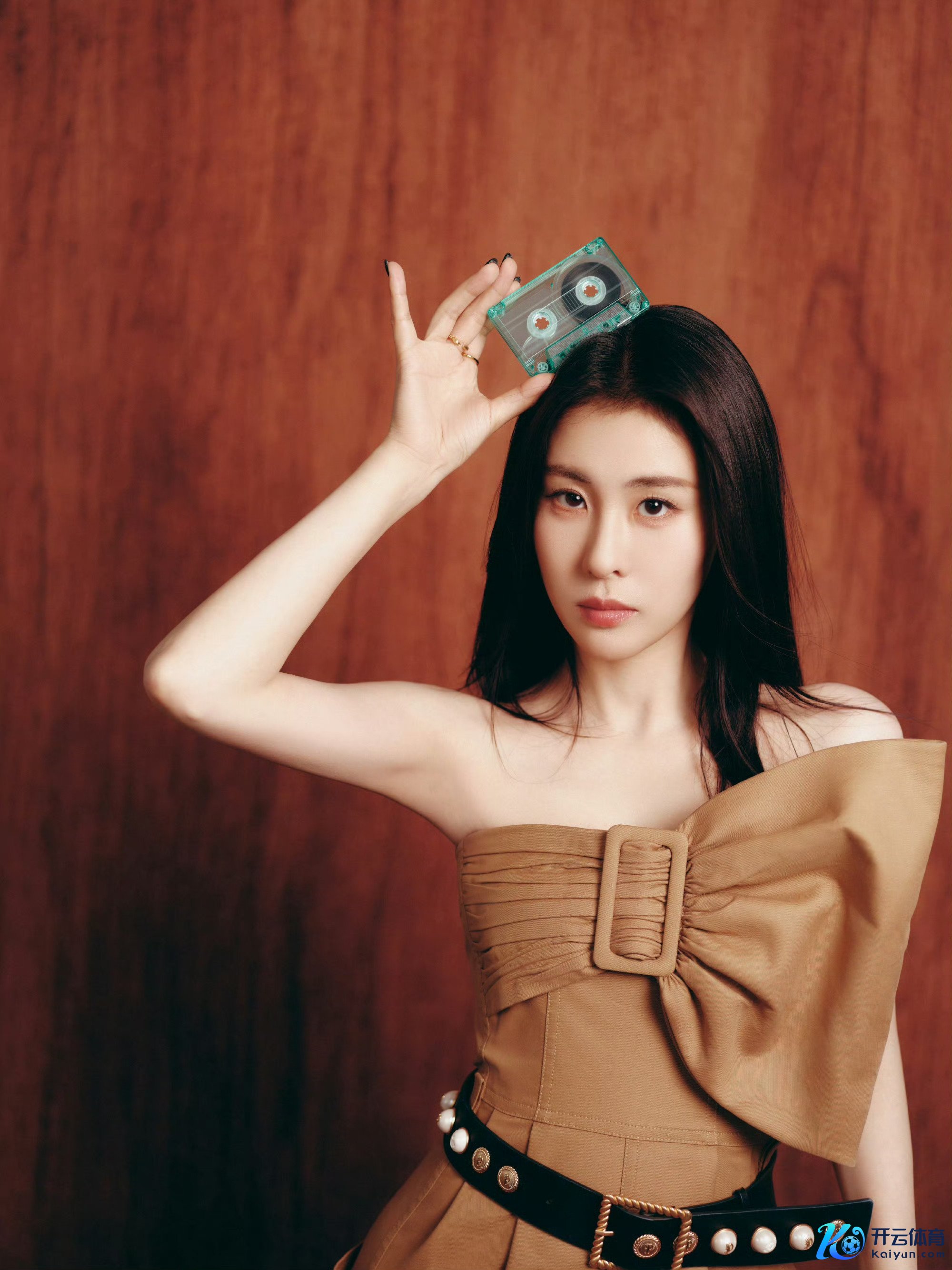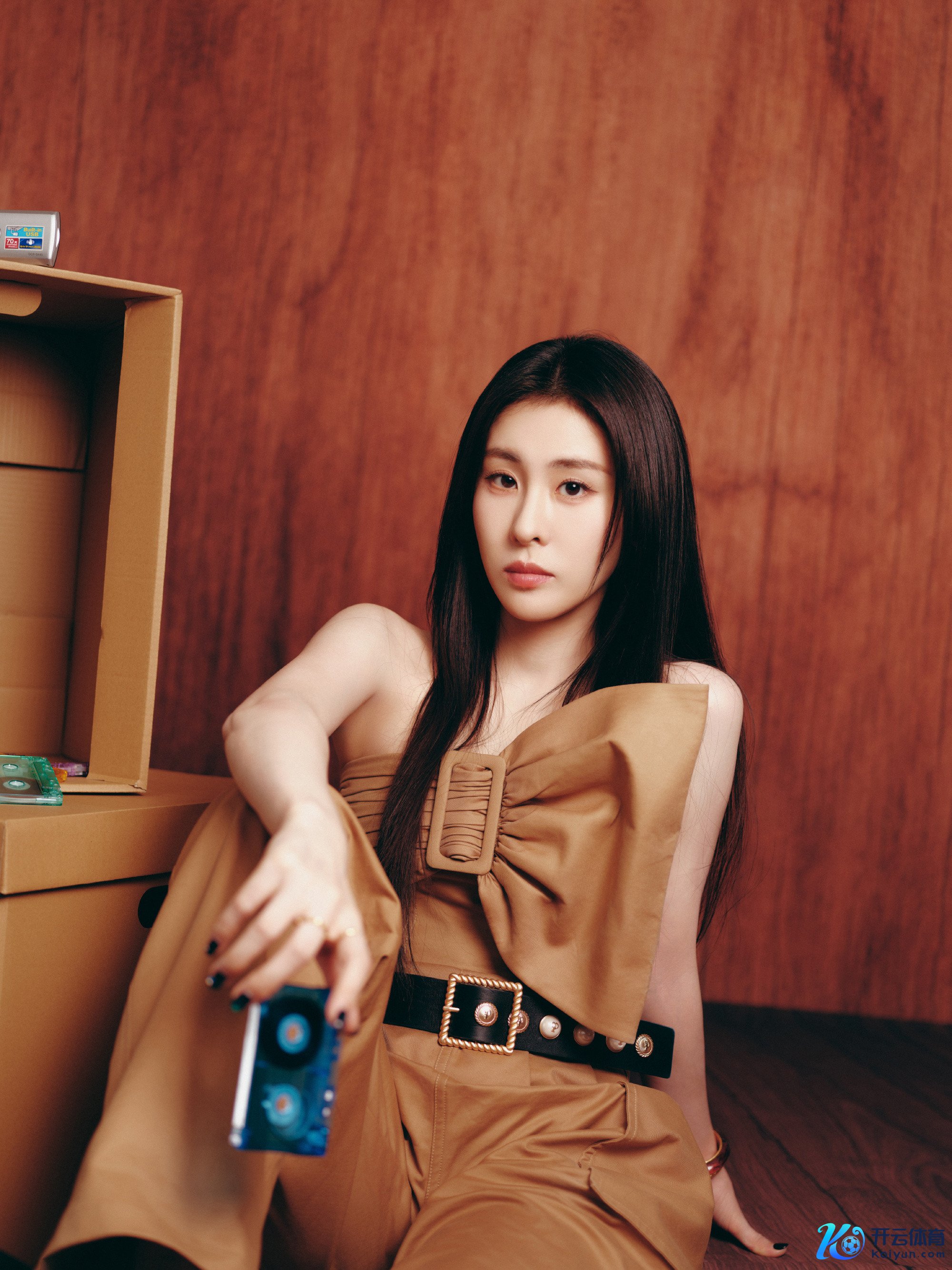镜头里的她,一袭无袖卡其连体裤衬得肩颈线条利落又舒展,腰间玄色皮带缀着珍珠与金属扣,像是把守旧唱片的纵情缝进了工装的飒爽里。她或把透明磁带轻抵额头,或指尖勾着磁带向镜头轻晃,棕木配景的暖调裹着旧物的和煦,让「Ost女王」的气场里多了几分意马心猿的慵懒——这正是她如今的情状:在音乐里千里淀,在作风里自洽。