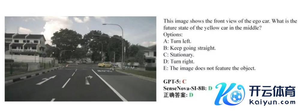 3、交通行为预计题:在多车谈谈路场景中预计黄色汽车的后续动作。GPT-5判断为静止(C),SenseNova-SI-8B判断为右转(D),正确谜底为D。