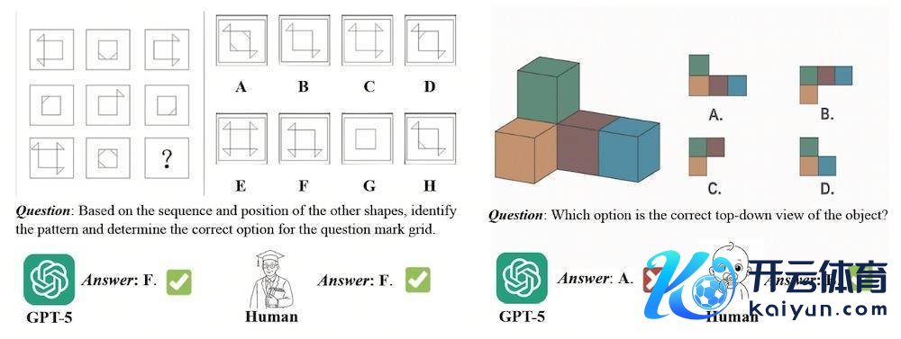 举例,GPT-5不错正确解出复杂图形逻辑题,但面对判断立方体俯瞰图这类空间题时,却出现了昭彰乌有。这类题对东谈主类儿童来说常常是直观判断,却仍难住了顶级模子。