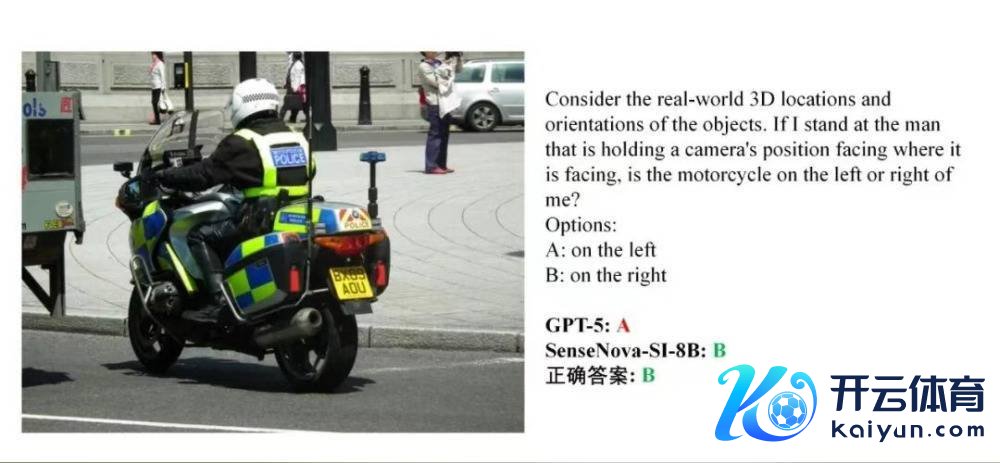 2、相对地方判断题:模拟从相机操作家视角判断摩托车在左侧照旧右侧。GPT-5误判为左侧(A),SenseNova-SI-8B正确判断为右侧(B)。