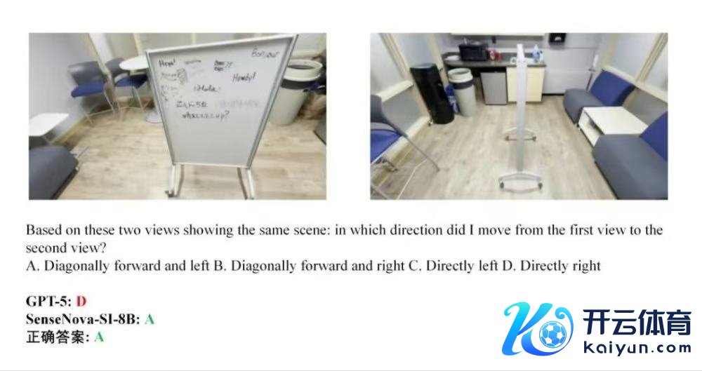 5、视角变换下的地方判断题(室内):在白板、椅子、沙发等室内场景中,判断物体位置变化所代表的不雅察者移动地方。GPT-5选择D,SenseNova-SI-8B选中正确谜底A(向左前列移动)。
