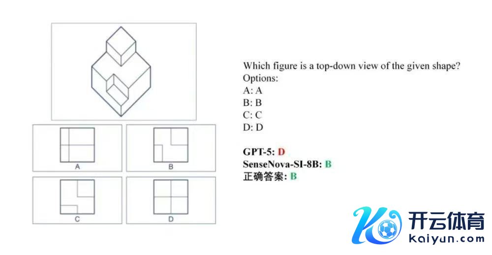 1、俯瞰图选择题:在立方体组合图形中,条目选择正确俯瞰图。GPT-5选择了乌有的D选项,SenseNova-SI-8B选择了正确的B选项。